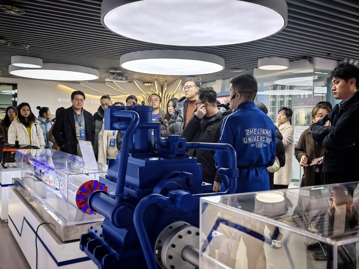 浙江大学科技馆是浙大科技事业跨越式发展的生动缩影,参观的第一站便是这里。宽阔的展馆里,全方位、立体式呈现了建校以来的标志性科研成果。在浙江大学求是文化宣讲队员张兴壘的讲解下,“分子围栏”催化体系、生物人工肝系统、自供电软机器人等各种高科技展品让老师们惊叹。透过沉甸甸的“国之重器”,可以窥见浙江大学深厚的科研实力与一位位潜心科研的科学家们的崇高理想和坚定信念。