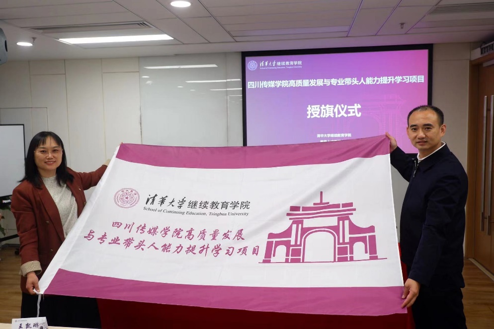 本次开班仪式由清华大学继续教育学院教育人才学习中心副主任罗炜、清华大学继续教育学院教育人才学习中心项目主管朱俐娜、四川传媒学院党委组织部部长樊潇雨出席。罗炜副主任发表致辞,她对四川传媒学院全体参培人员的到来表示热烈欢迎,并以清华三宝——校训、校园以及校友为出发点,细数了清华大学历史渊源、革新发展等。我校代表樊潇雨部长随后发言表达了对清华大学继续教育学院的感谢,同时向本次参培教师提出了“提高认识、把握大局”“提升本领、主动作为”“振奋精神、严格要求”的三点学习指示。最后进行授旗仪式,本次培训正式拉开帷幕。