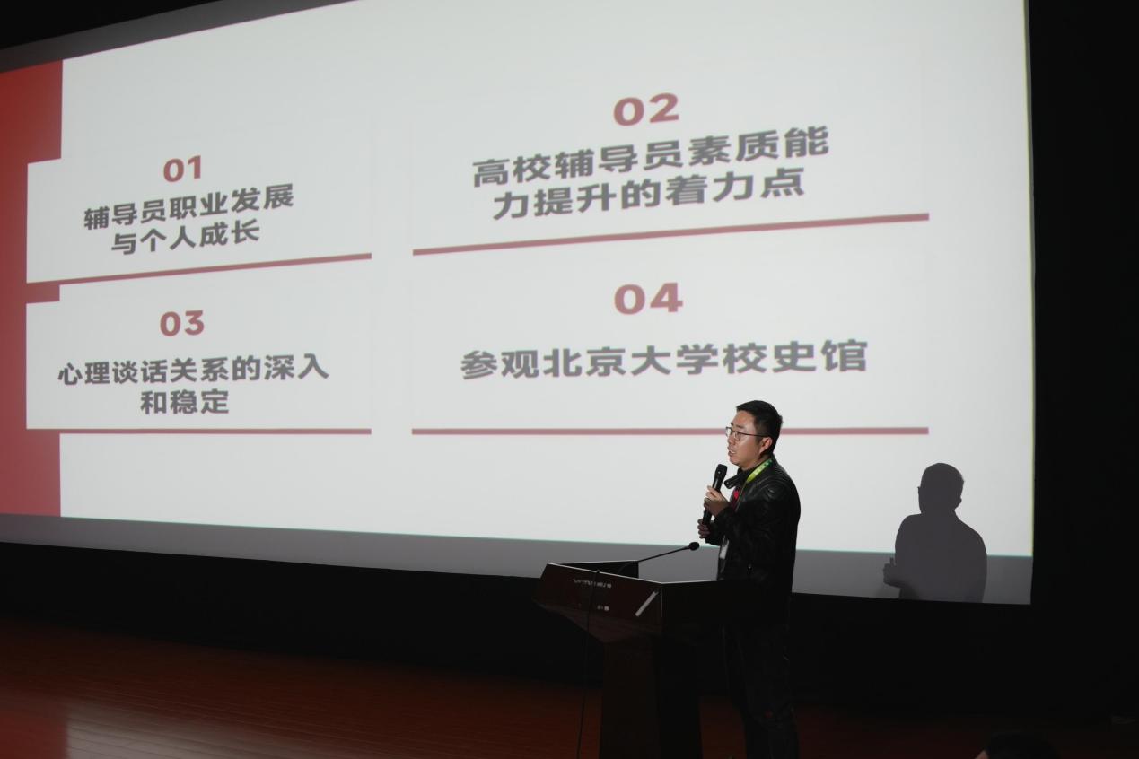 在培训会上,编导艺术学院分党委书记王禹明作为主讲嘉宾,为与会人员带来了精彩的分享。他结合自己参加“北京大学-高校辅导员队伍建设暨辅导员职业核心素养提升专题研修班”的学习经历,深入浅出地讲解了辅导员职业核心素养的重要性及其提升路径,详细的对课程中授课老师的内容进行了分享。王禹明书记强调,辅导员作为大学生思想政治教育的骨干力量,必须具备坚定的政治立场、高尚的职业道德、扎实的专业素养和出色的工作能力。他鼓励大家要不断学习新知识、新技能,不断提升自己的综合素质,为学生的成长成才提供更加有力的支持。
