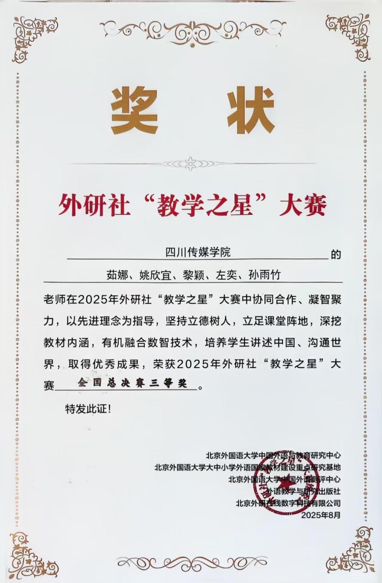 2025年8月4日,我校有声语言艺术学院播音主持艺术(双语播音)专业茹娜、姚欣宜、黎颖、左奕、孙雨竹教师团队获2025年外研社“教学之星”大赛英语专业组全国半决赛二等奖(暨全国总决赛三等奖)。