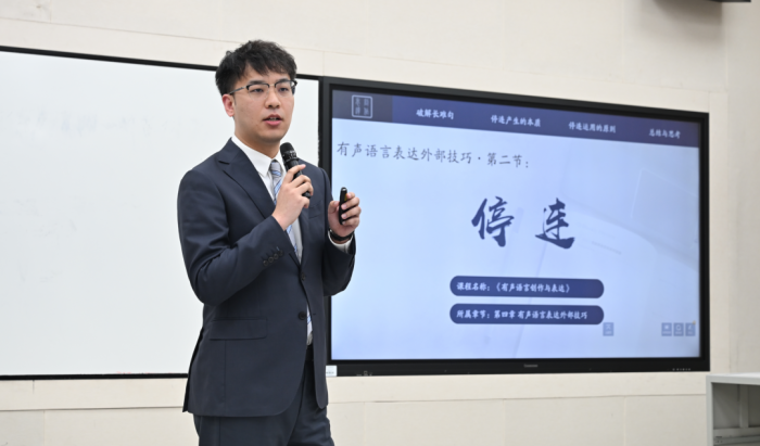 王瑞老师以《有声语言创作与表达》中的“停连”为主题,从生理、心理双维度解析,并引导学生思考AI时代下人类言说的“主体性”,兼具技巧与人文深度。