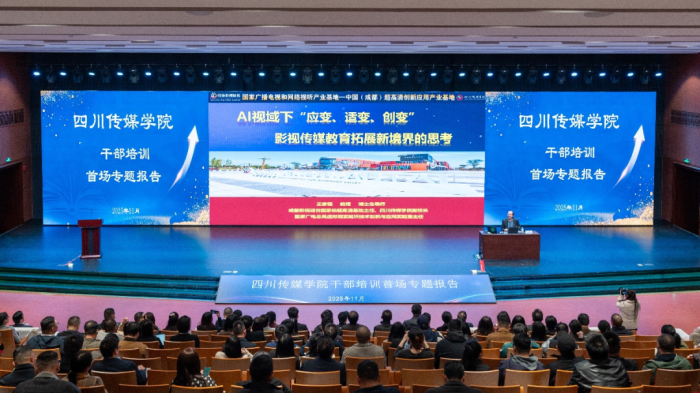 四川传媒学院副校长王家福教授作题为《AI视域下“应变、适变、创变” 影视传媒教育拓展新境界的思考》的培训报告,深入剖析了人工智能生成内容(AIGC)对影视艺术创作与传媒教育带来的深刻变革。他从国家政策导向、行业数据与发展趋势等多维度论证AIGC正由技术工具加速演变为重塑影视传媒教育生态的关键力量,深刻改变内容生产格局、传播路径、业态结构和人才培养模式。结合国家文化和旅游部《关于推动数字文化产业高质量发展的意见》及典型案例,系统阐释了AIGC赋能影视新质生产力的路径,并介绍了学校依托国家广电总局“虚拟现实视听技术创新与应用实验室”所取得的产教融合成果,展示了我校在“AI+传媒”领域的前瞻探索与实践成效。他呼吁全体干部紧跟时代步伐,提升能力素养,改革教学方法,共同推动学校高质量发展。