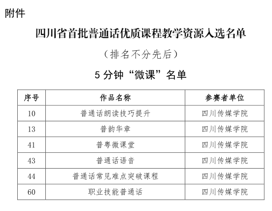 近日,四川省教师发展中心正式公布首批普通话优质课程教学资源遴选结果,我校教师申报的6门课程入选5分钟“微课”名单,入选数量位居全省高校前列,成绩斐然。